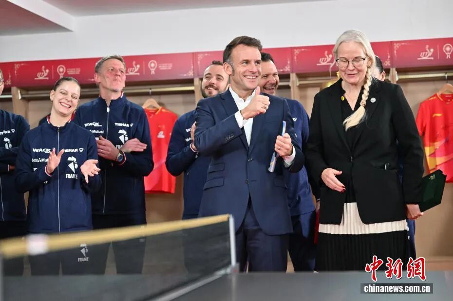 在成都,马克龙看望参加混团世界杯比赛的法国乒乓球运动员,并与他们一起同中国运动员挥拍较量。
