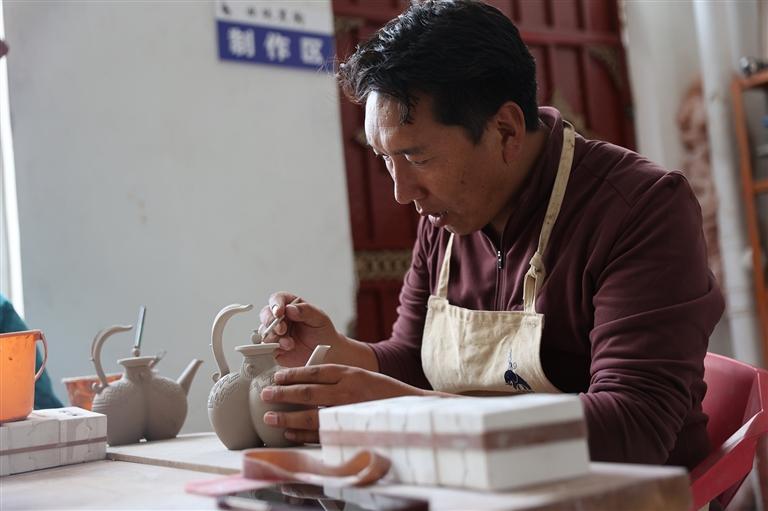 在该公司产品展示区,一件件精美的黑陶制品整齐陈列摆放,茶具、锅、碗、摆件……这些在传统技艺上又加以创新的黑陶产品,既坚守了千年传承的老规矩,又融入新时代的新想法,似在无声诉说着察雅黑陶在时代浪潮中的传承。