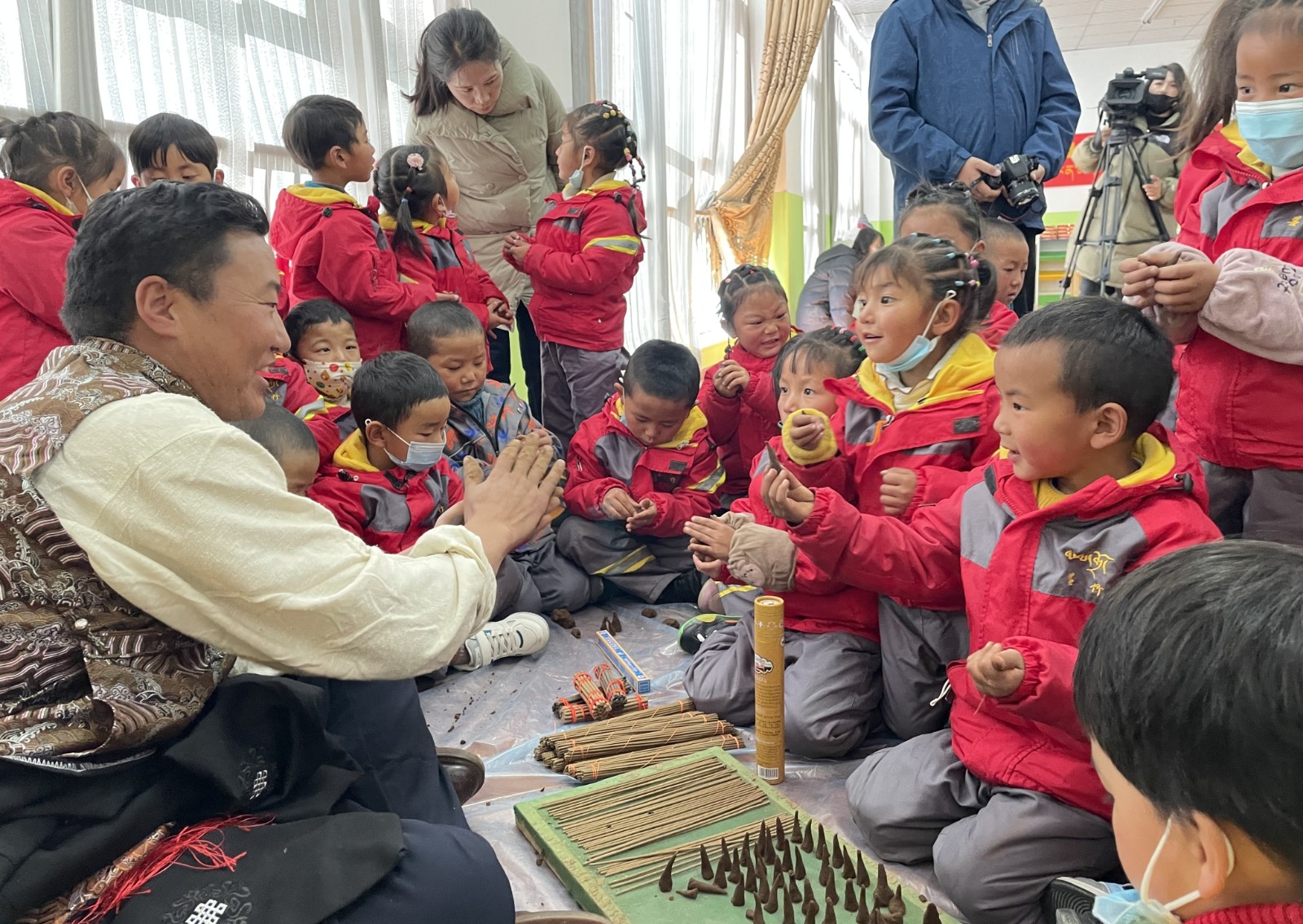 当地小学生和洛桑一起体验藏药香制作。