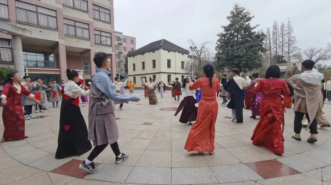 ▲民族舞蹈社团的同学们身着民族服装,跳起锅庄舞。 南通中学供图
