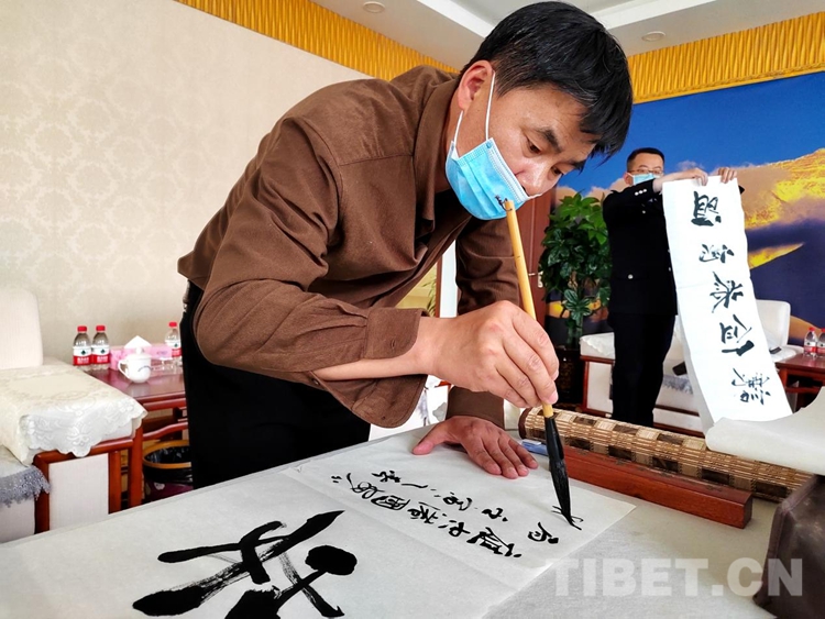 活动邀请的西藏自治区文联3名书法家在现场泼墨挥毫。在场民警们纷纷在佳作前驻足欣赏,细细品味,感受到了笔墨之美,并与书法家们面对面交流,虚心求教。此外,西藏自治区文联赠送四幅书法作品以示祝贺。
