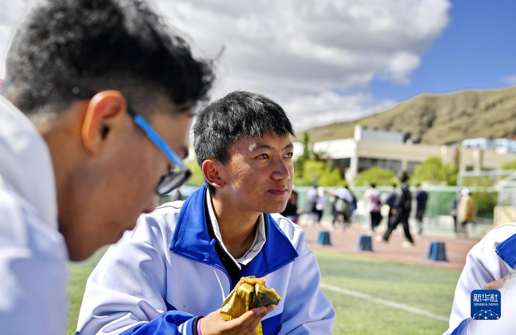 山南市第二高级中学的学生在操场吃粽子(6月3日摄)。新华社记者 刘洲鹏 摄