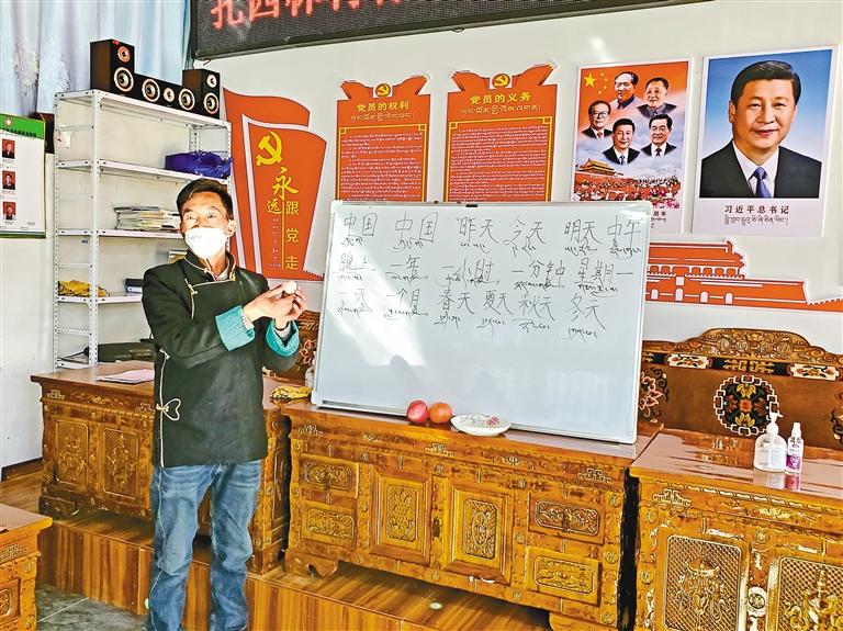 图为扎西林村干部为群众普及国家通用语言文字。记者 陈林 扎西顿珠 摄