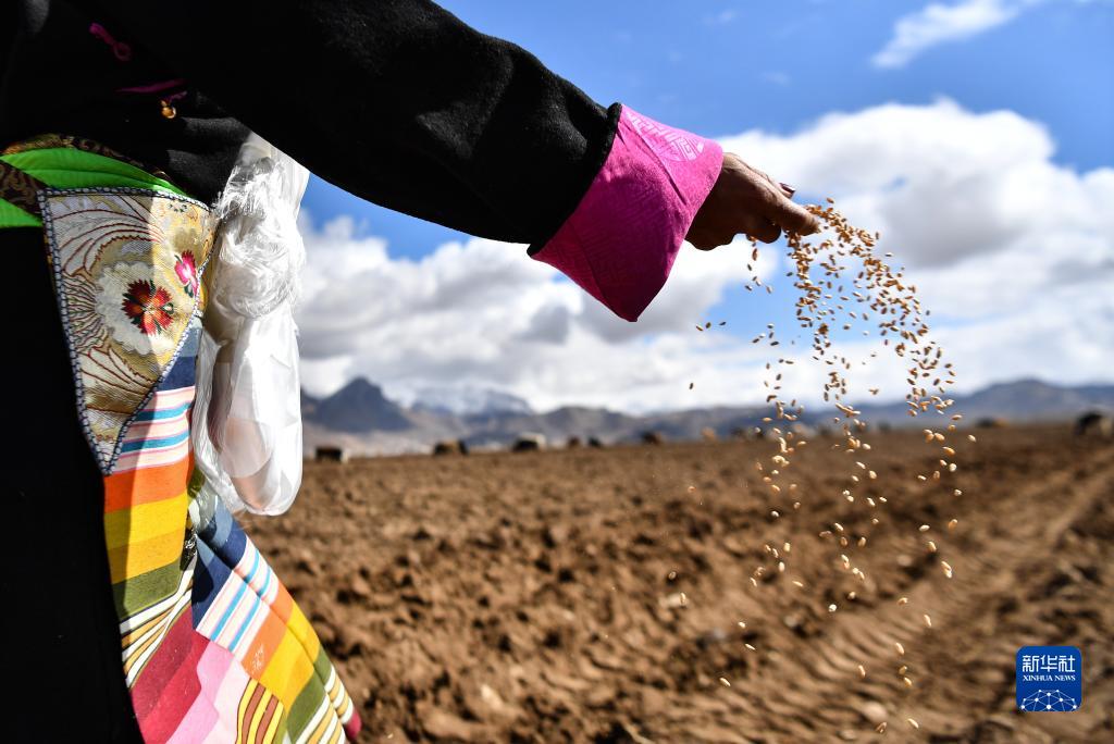 在西藏林周县强嘎村的春耕仪式上,身着盛装的村民在播撒青稞种子(3月16日摄)。新华社记者 晋美多吉 摄