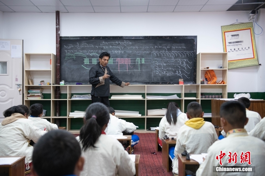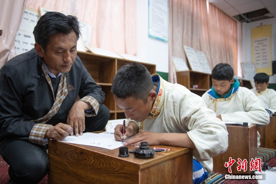 5月7日,西藏山南市,加查县中学藏文书法兴趣班的教师扎西达瓦给学生们上课。该兴趣班由2名藏文教师任教,每周两课时,利用自习课或晚自习时间为学生和教师授课。课程内容包含执笔、运笔、姿势等基础书写技能,以及藏文中的乌金体、珠擦体、簇仁体、簇通体等各类字体的书写方法。