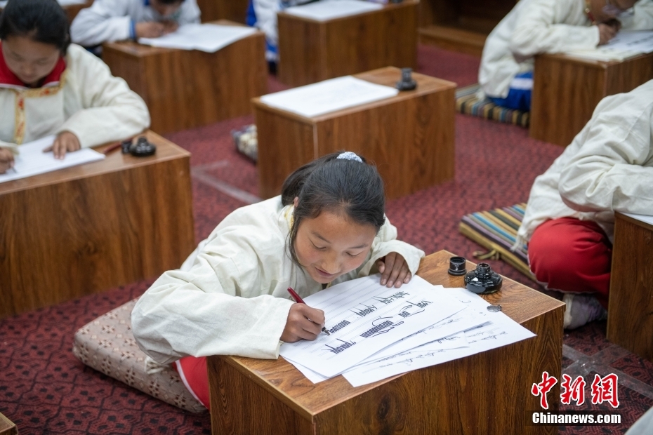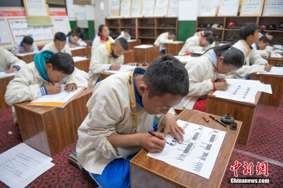 5月7日,西藏山南市,加查县中学学生在上藏文书法兴趣班。该兴趣班由2名藏文教师任教,每周两课时,利用自习课或晚自习时间为学生和教师授课。课程内容包含执笔、运笔、姿势等基础书写技能,以及藏文中的乌金体、珠擦体、簇仁体、簇通体等各类字体的书写方法。