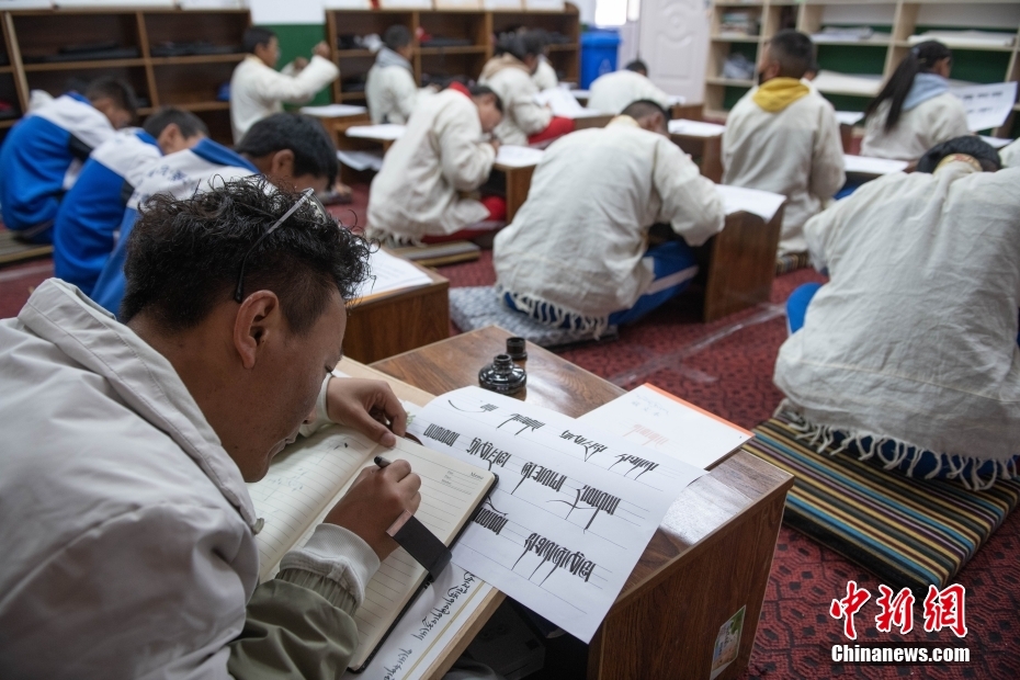 5月7日,西藏山南市,加查县中学学生和教师在上藏文书法兴趣班。该兴趣班由2名藏文教师任教,每周两课时,利用自习课或晚自习时间为学生和教师授课。课程内容包含执笔、运笔、姿势等基础书写技能,以及藏文中的乌金体、珠擦体、簇仁体、簇通体等各类字体的书写方法。