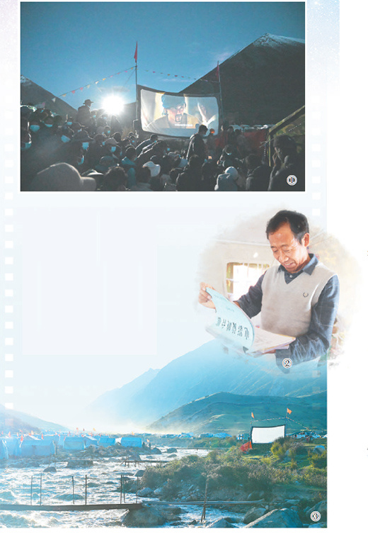 图①:夜幕降临,西藏山南市加查县的山谷里正在放映电影《湄公河行动》。 |