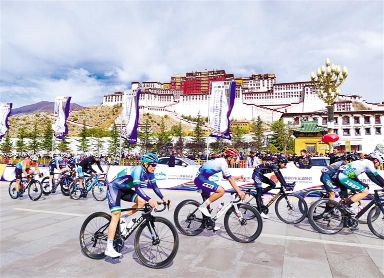 图为参赛选手骑行在布达拉宫前。