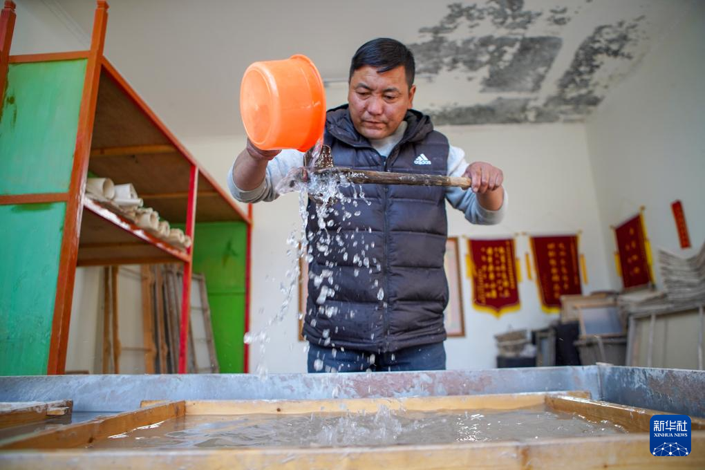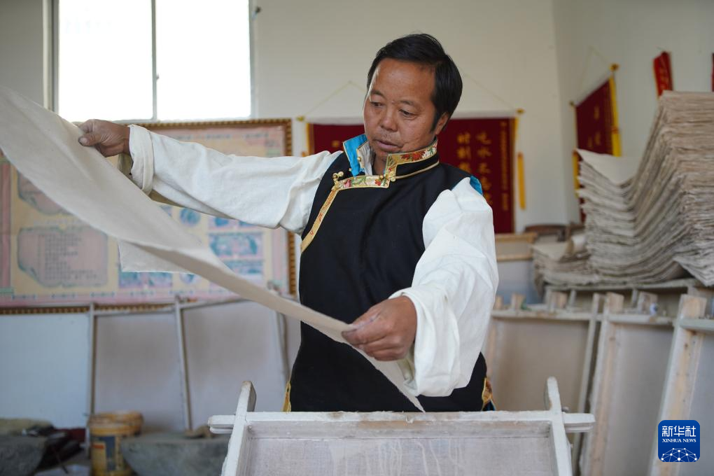 格桑旦增在检查刚取出的藏纸的质量(12月5日摄)。新华社记者 邵泽东 摄