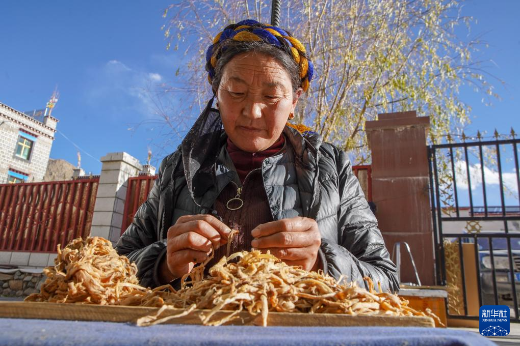 尼木县塔荣镇雪拉村村民在给狼毒草分丝,这是制作藏纸的步骤之一(12月5日摄)。新华社记者 关明辉 摄