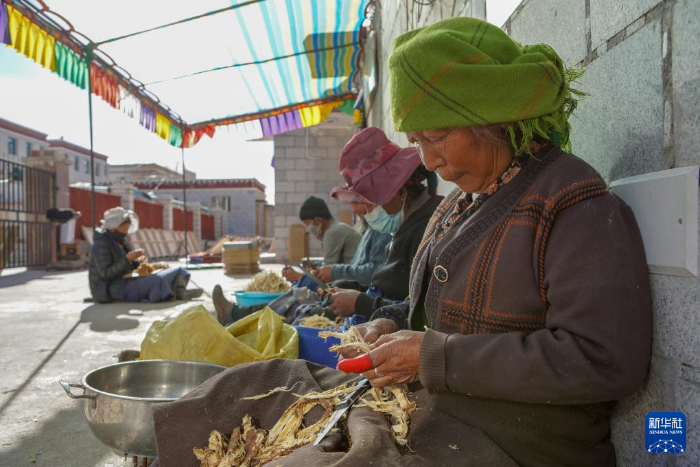 尼木县塔荣镇雪拉村村民在给狼毒草去皮,这是制作藏纸的步骤之一(12月5日摄)。新华社记者 邵泽东 摄