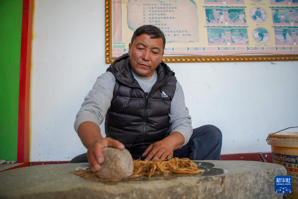 格桑旦增的弟弟普琼用石头捶打狼毒草,这是制作藏纸的步骤之一(12月5日摄)。新华社记者 关明辉 摄