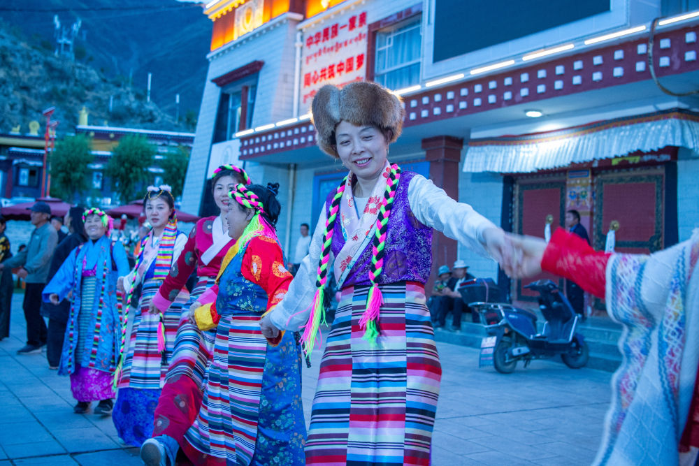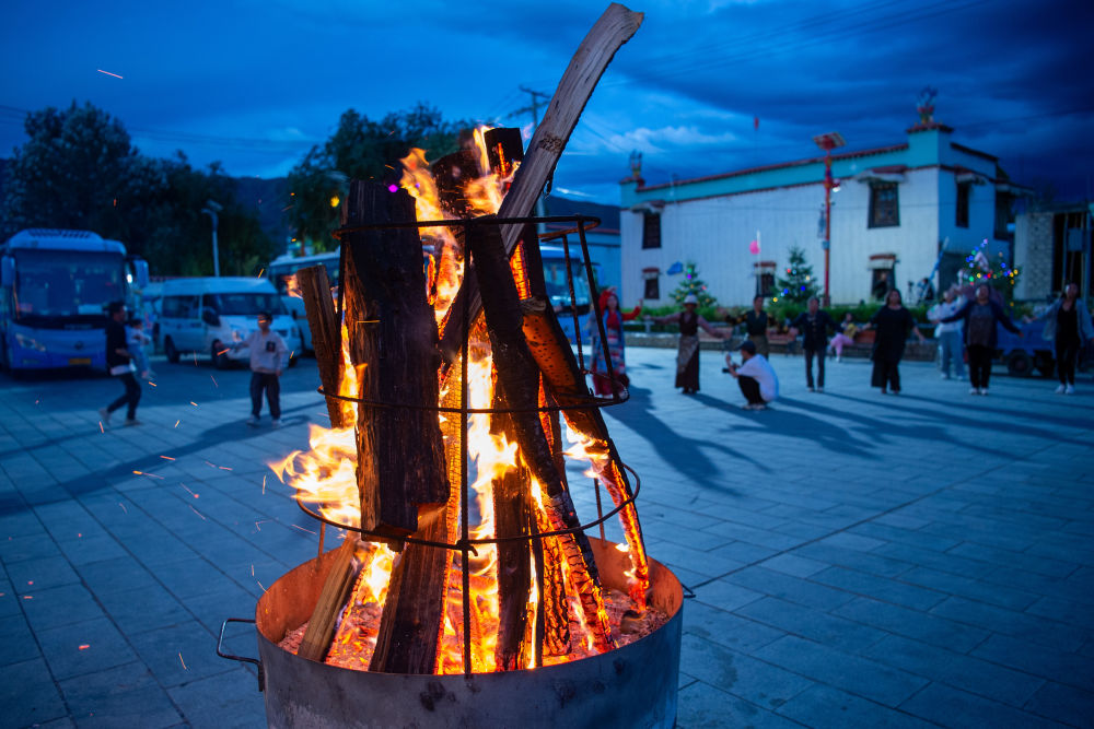 6月24日,游客在扎西曲登社区广场体验篝火广场舞。新华网 旦增努布 摄