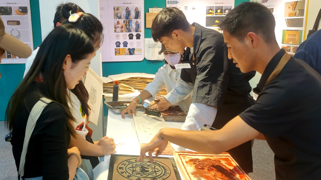 在文创区,雕版被玩得“脑洞大开”。一组抢眼的提灯,灯面是矢量处理的拓片图案,它带手柄的木框正是西藏雕版的传统形状。手机壳、钥匙扣、文化衫和帆布包也印刻上雕版图案,连同亲手完成的拓片一起,成为“带得走”的“文物”。