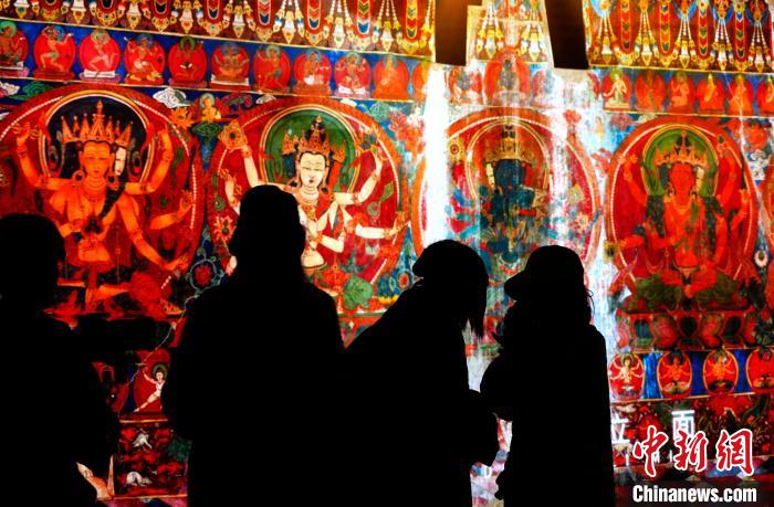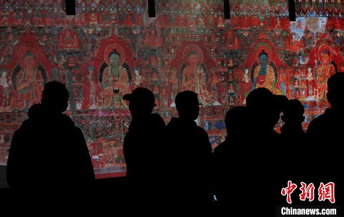 5月18日是第49个国际博物馆日,今年的主题是“快速变化社会中的博物馆未来”,西藏博物馆迎来参观热潮。图为观众在西藏博物馆内欣赏阿里古格经典壁画数字化成果展。中新社记者 李林 摄