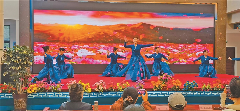 10月1日上午,“欢度国庆 银龄童心颂华诞 共贺西藏六秩春”活动在拉萨市城关区老年人日间照料中心举行,演员们用欢快的歌曲、优美的舞姿,抒发对祖国的无限热爱和对美好生活的赞美之情。图为演员表演朝鲜族舞蹈《红太阳照边疆》。记者 王艺霏 摄