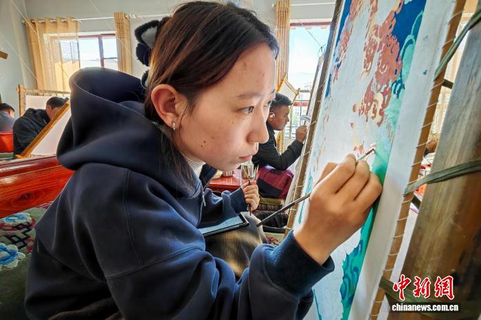 10月21日,西藏唐卡画院女学员南草吉正为一幅唐卡进行上色。中新社记者 江飞波 摄