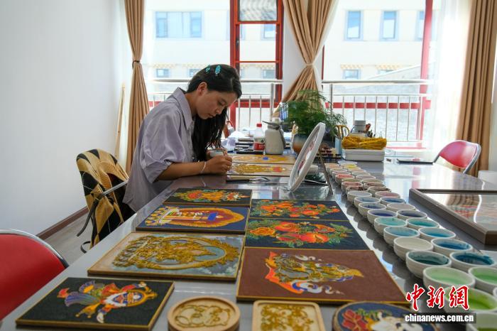 10月21日,硕士毕业的尼玛仲格在西藏唐卡画院进行掐丝珐琅唐卡制作。中新社记者 江飞波 摄