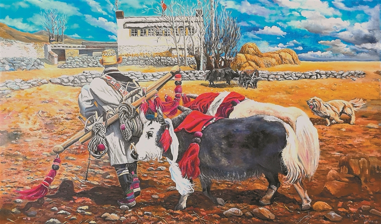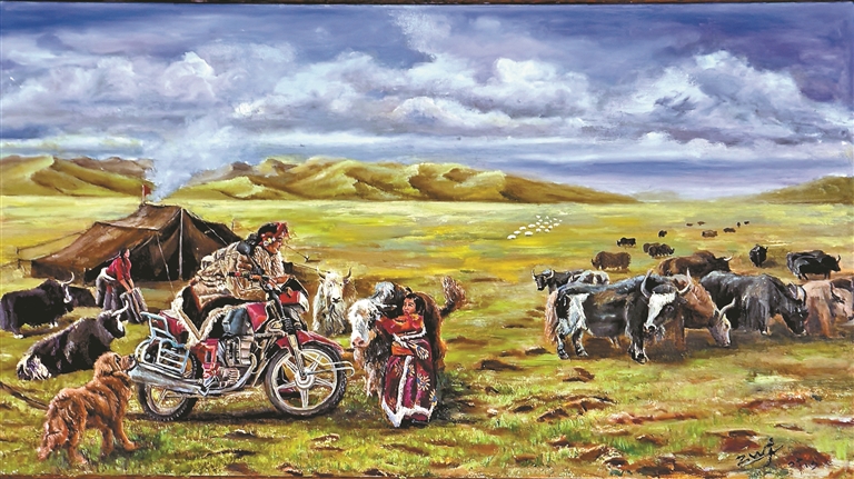 在邹文江的画笔下,《草原新景》展现的是牧民骑着摩托车放牧,蓝天白云下,现代化的交通工具与远处的雪山相映成趣;《记忆——纪念修建川藏公路》描绘的是十八军战士修建川藏公路时的险峻场景,崇山峻岭间,奔腾不息的怒江咆哮而过,正在修路的十八军战士显得渺小又伟大;《边陲人家》记录的是一户边境牧民家庭悠闲放牧的生活场景……他的作品中,既有圣洁的雪山、辽阔的草原、成群的牦牛,也有现代化的学校、医院、民居和牧民的笑容。