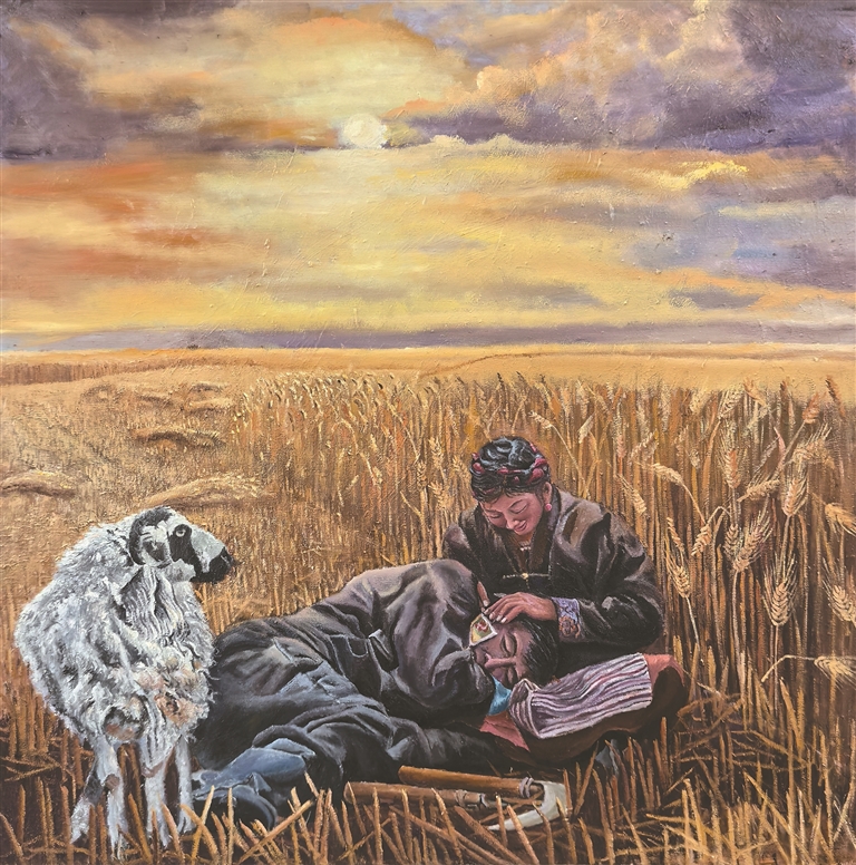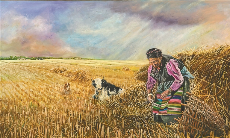 图为邹文江油画作品《田野间的劳作时光》(局部)。