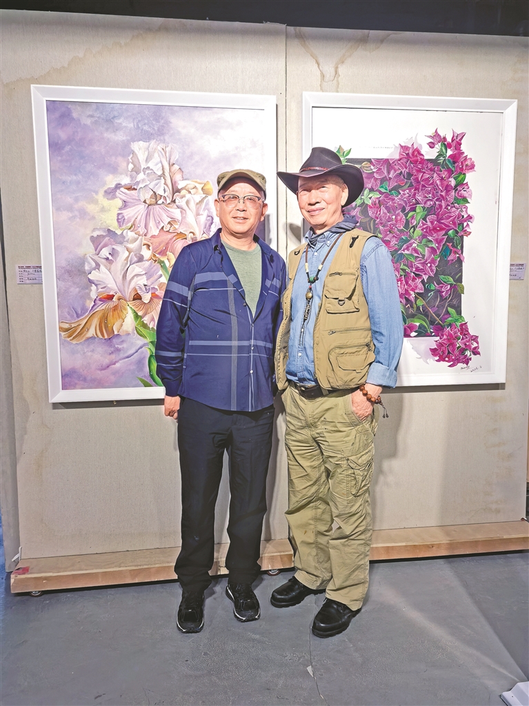 图为邹文江与著名军旅画家敬庭尧老师在作品前合影留念。