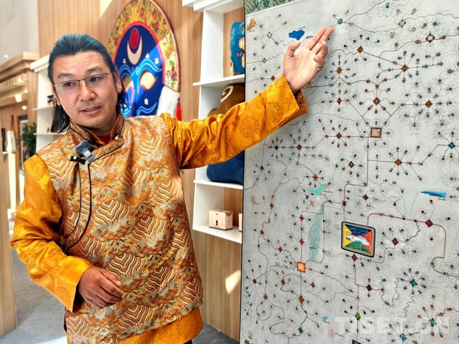 图为拉欧达布向记者介绍《西藏公路坛城》