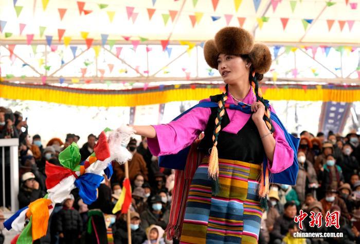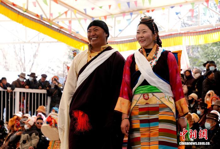 1月2日,“新岁风华,衣彩拉萨”2026年拉萨新年服饰秀子活动在布达拉宫脚下的宗角禄康公园举行。活动分为拉萨非物质文化遗产代表性项目演艺服饰秀与农牧民妇女“村T”秀两部分,通过演艺服饰与日常生活劳动服饰及场景的展示,生动呈现拉萨独特的地域文化与民族风情。图为拉萨非物质文化遗产代表性项目演艺服饰秀现场。中新社记者 李林 摄
