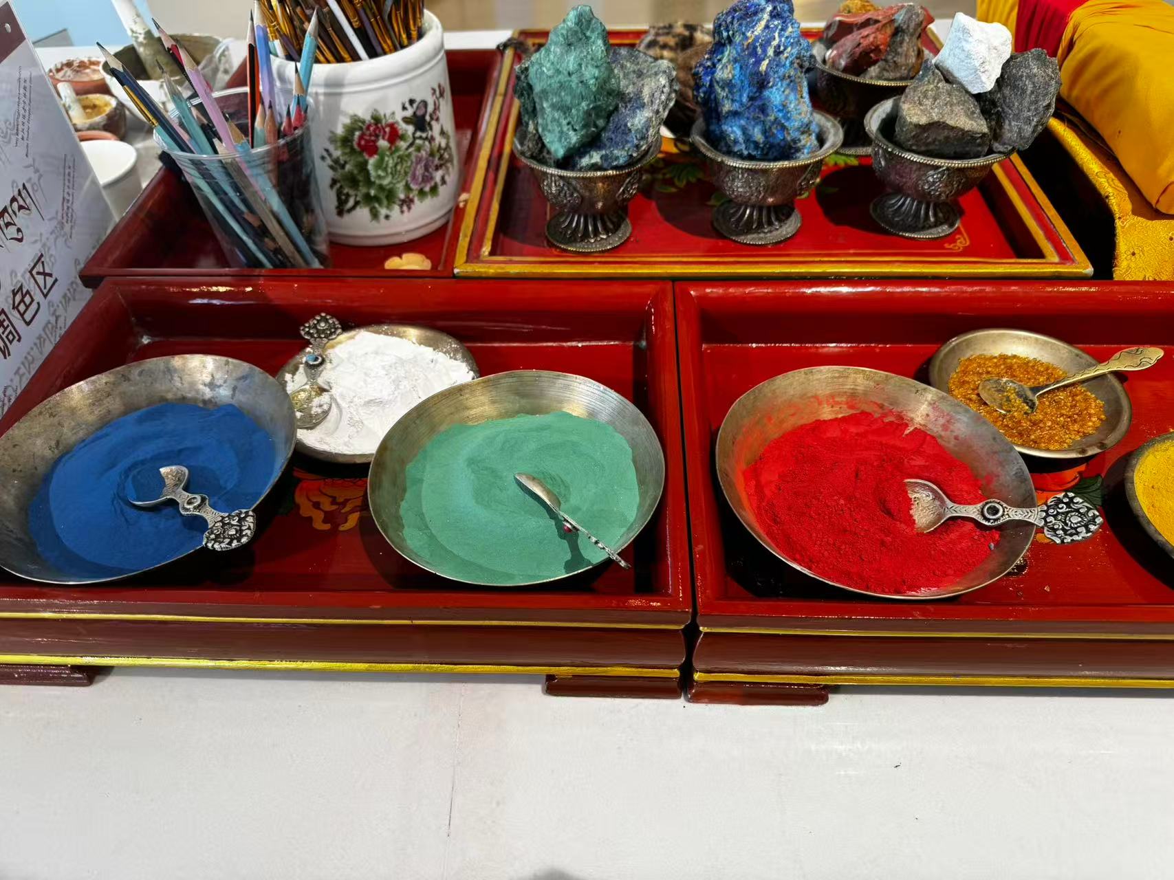 颜料则源自天然矿石和植物。工作台上的小陶罐里,装着精心研磨的孔雀石、青金石、朱砂等。“机器磨的颗粒不均匀,画不出有生命力的色泽。”体验馆画师群培说,手工研磨颜料至今仍是入门必修课。