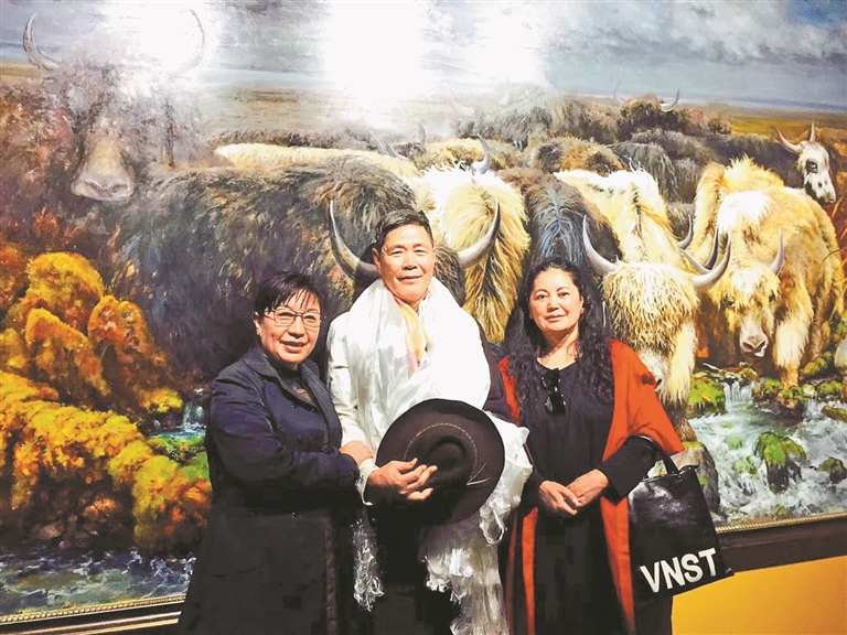 图为唐瑟达娃(右一)和友人在画展上合影。记者 卢文静 摄
