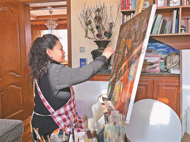 图为唐瑟达娃在作画。记者 卢文静 摄