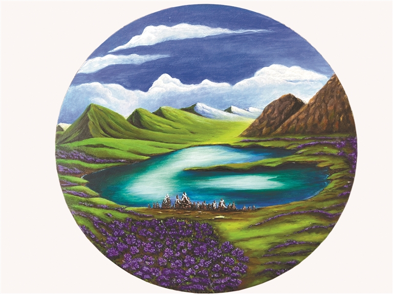图为唐瑟达娃作品《美丽的思金拉措》。记者 卢文静 摄
