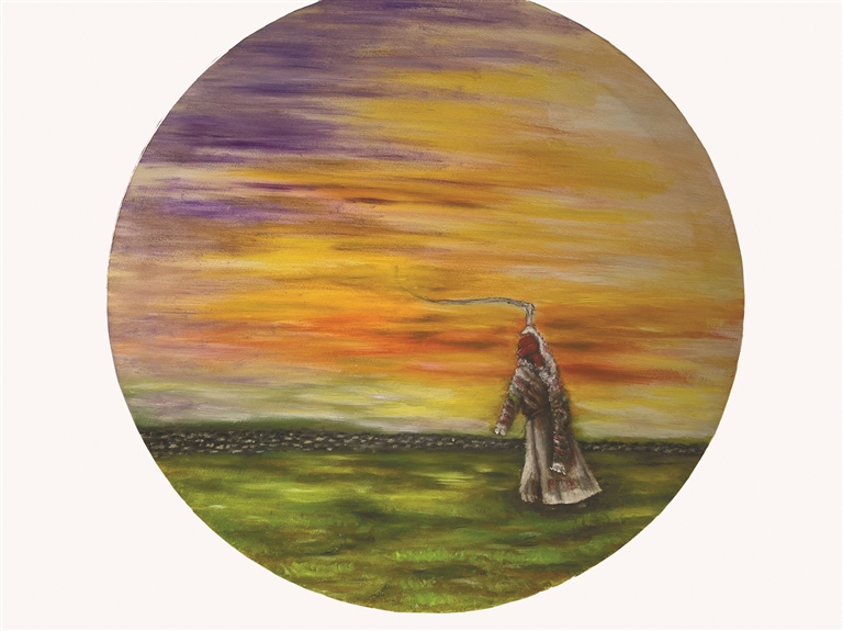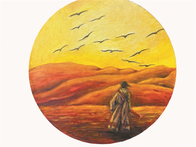 这种融合,在她的作品中绽放出独特的光彩。她的作品《在路上》在第二届“和美西藏”美术作品大赛上获优秀作品奖。这幅作品描绘了曲水县俊巴村渔民劳作的日常诗篇,画面上,夕阳将雅鲁藏布江染成金红色,一位渔民背着轻巧的牛皮船,踏着蜿蜒的村道归家。他的身躯因负重而微微前倾,脚步却轻快有力,嘴里似乎还哼唱着渔歌,整个画面流淌着收获的满足与归家的愉悦。