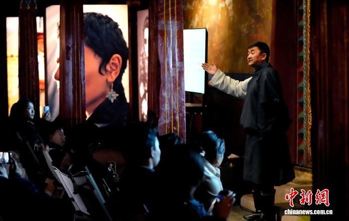 图为藏戏研究专家、西藏自治区艺术研究所副研究员桑吉东智博士为观众梳理藏戏发展的历史坐标与艺术特征。李林摄