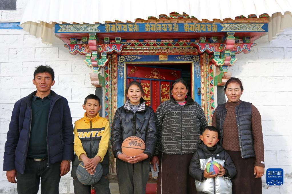 林芝市嘎拉村村民达瓦坚参(左一)一家在家门口合影(2022年2月23日摄)。新华社记者 姜帆 摄