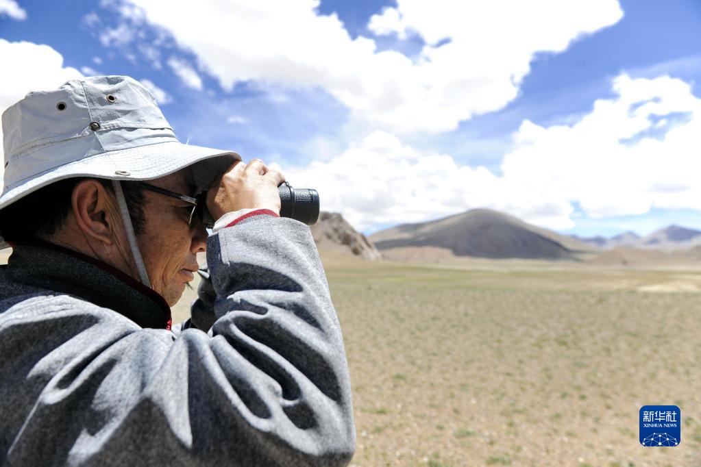 在羌塘国家级自然保护区,野保员用望远镜观察野生动物(2018年8月4日摄)。新华社记者 张汝锋 摄