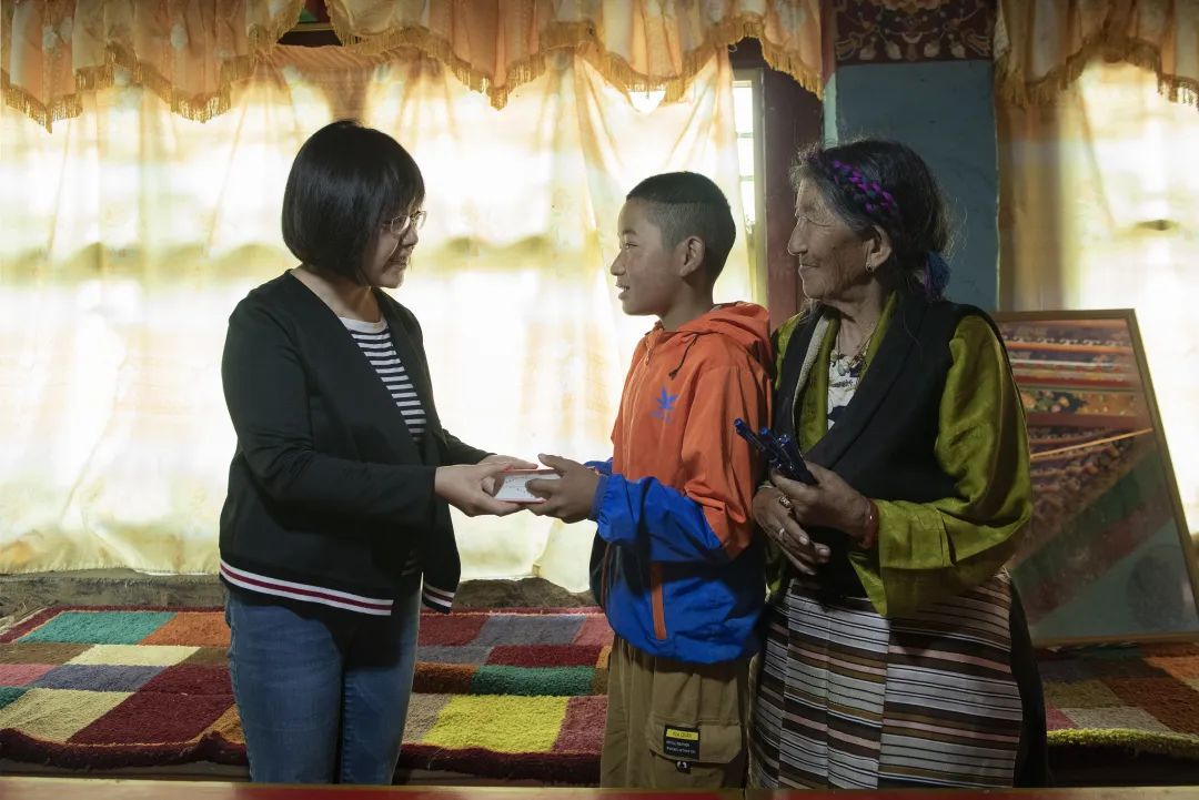 宋晓婧(左一)向“结对帮扶”户中的学生赠送学习用品