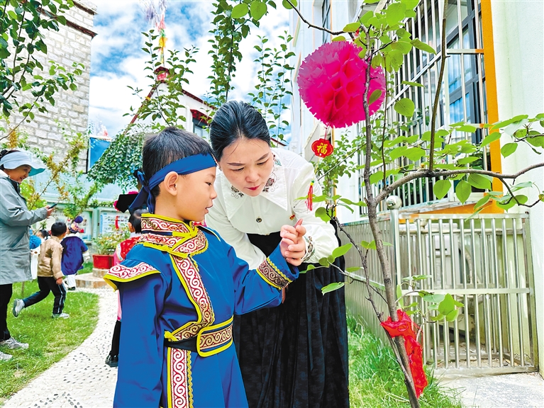 拉萨市实验幼儿园东城分园举办“庆国庆、迎中秋”活动。这是一名小朋友在老师的指导下猜灯谜。本网记者 李洲 唐斌 格桑伦珠 摄