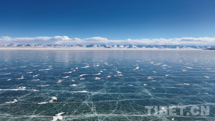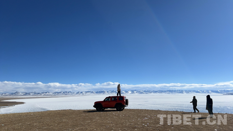 爬上一座山丘,视野陡然明亮开阔起来。原本土黄色的藏北天然牧场高低起伏,黑牦牛零星地散落在山坡,登上高处后,天际圣境纳木错便映入眼帘。初春时节的拉萨依然春寒料峭,纳木错的落雪还未完全消融,站在高处俯视,这片安静的大湖被阳光反射得白茫茫一片。更幸运的是碰到了晴好的天气,白云与湖冰相衬,亦与远山相接,视线尽头的念青唐古拉山脉直视无碍,画面犹如“半池白云半池玉”般颇具美感。