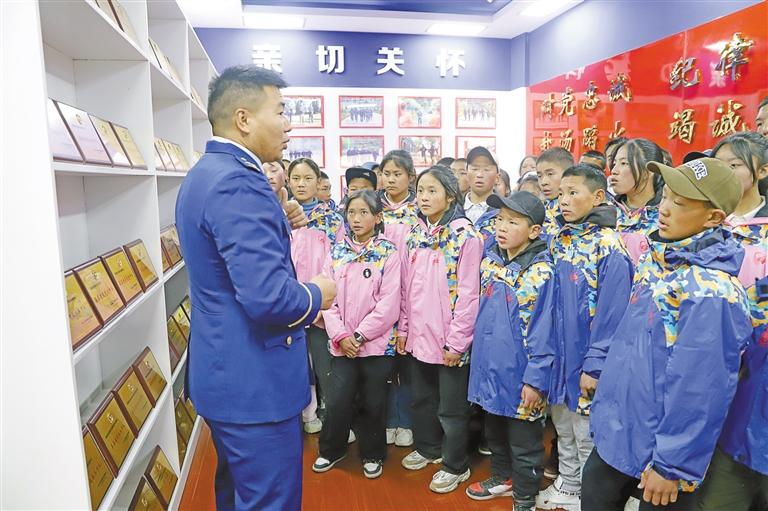 图为消防员为师生们讲解队伍荣誉。记者 贡秋曲措 摄