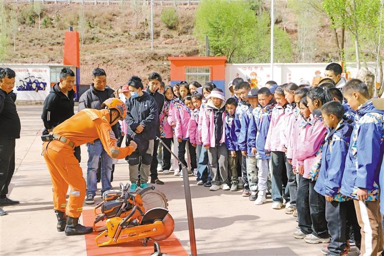 图为消防员为师生们介绍各类装备。记者 贡秋曲措 摄