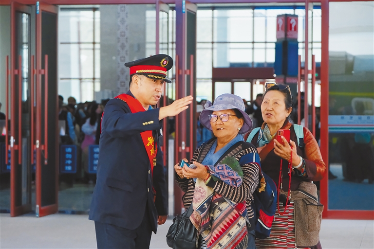 林芝火车站工作人员为旅客指引车厢位置。记者 谢筱纯 王珊 摄