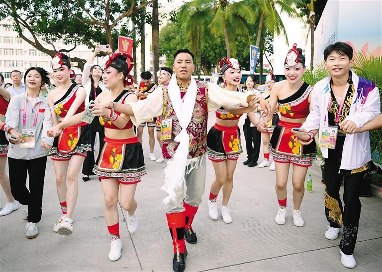 11月26日,运动会特别安排了“民族大联欢”活动。独具海南特色的牛角号与蛙锣齐齐奏响,喜迎八方宾客,表演者、运动员、教练员一起手拉手载歌载舞。西藏运动员身着盛装,和来自北京西藏中学的运动员一起唱藏歌、跳锅庄、送礼物,和香港特别行政区运动员互送吉祥物、纪念品,相互交流、拍照留念。