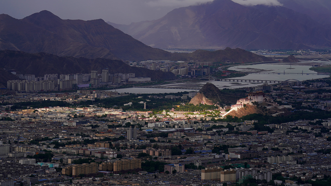 阳光恰到好处地照在布达拉宫,与四周形成鲜明的明暗色彩对比,而远处的峻岭河流又与高楼大厦形成了自然与城市景观对比,构成了一幅美妙的画面。
