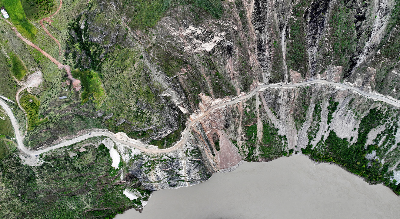 图片拍摄于丙察察路段西藏境内,展示了西藏公路建设的艰难和人们遇水架桥、逢山开路的意志。