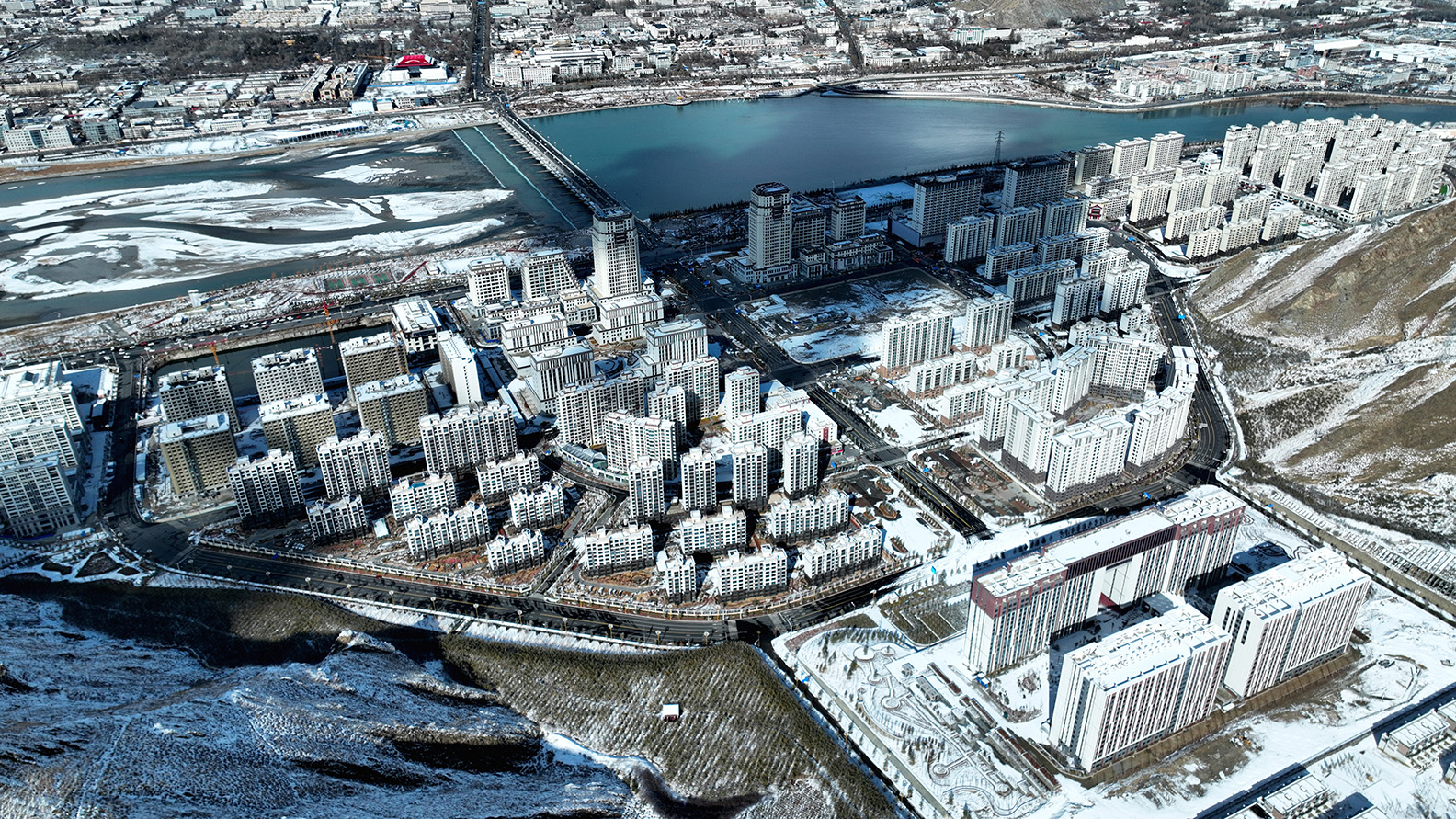 被薄雪覆盖的拉萨顿珠金融城干净、整洁,体现出整齐的建筑美感。