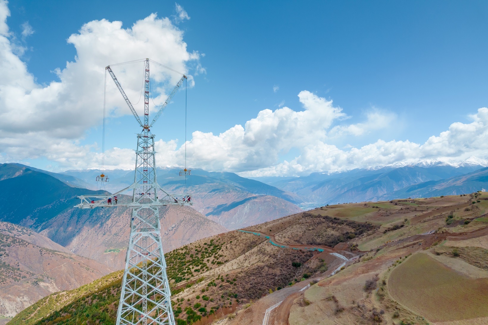 图为金上至湖北±800千伏特高压直流输电工程线路工程藏1标施工人员正在进行组塔作业(资料图片)。 赵清鹏 摄