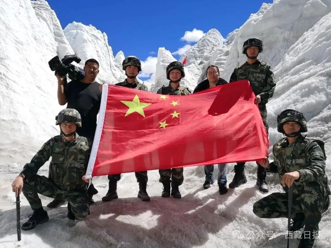 山南电视台记者普拉和西藏日报社记者彭琦国庆节在边境线上和边防官兵一起祝福祖国母亲生日快乐。