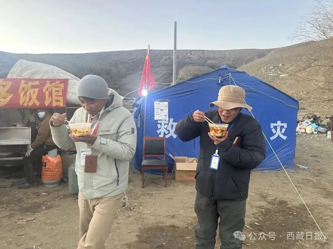 1月7日,西藏日喀则市定日县发生6.8级地震。图为西藏日报记者在震区采访报道间隙吃上热乎饭。