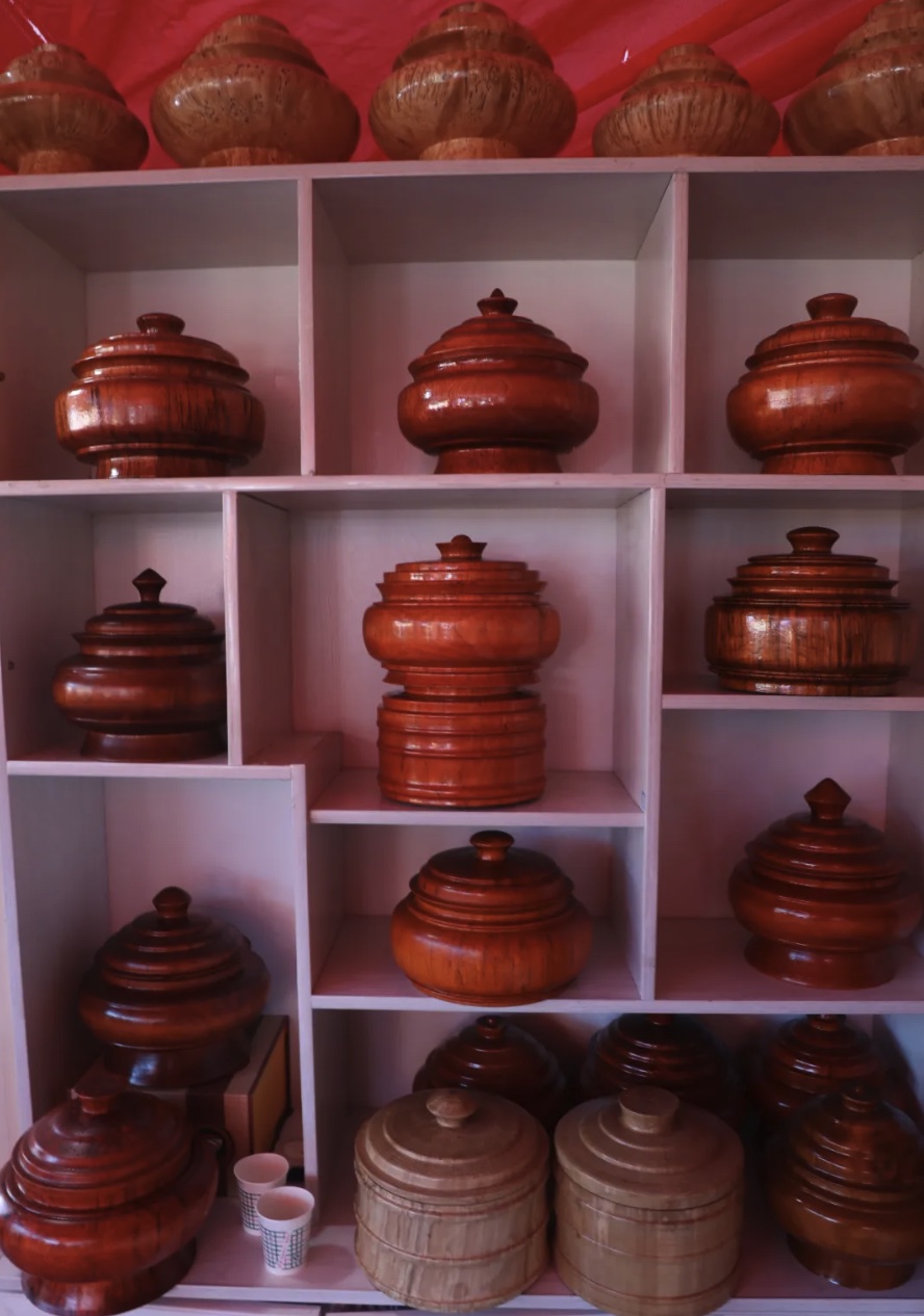 用来盛糌粑的“巴波”、喝青稞酒的“羌波”、吃饭用的“多波”……在自治区级非物质文化遗产代表性项目代表性传承人、国家级乡村工匠桑珠的摊位上,各种规格的木碗在阳光下熠熠发光。